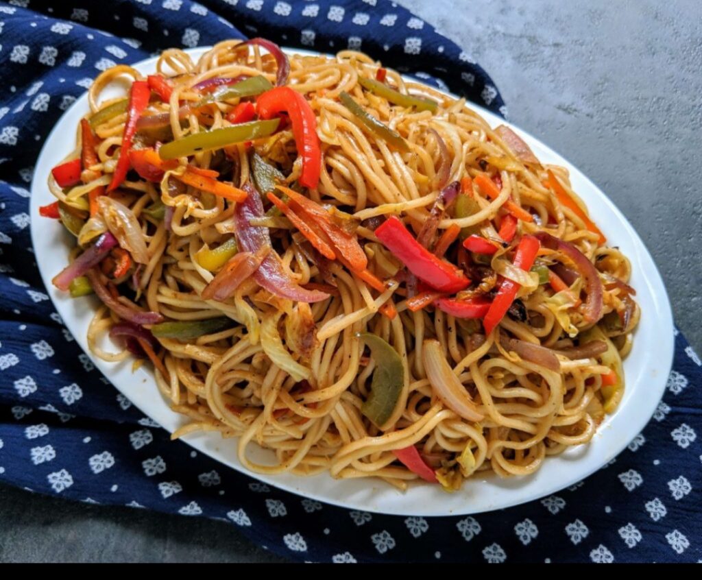 नूडल्स – 200 ग्राम (कोई भी हक्का नूडल्स)तेल – 2-3 टेबल स्पून (तेज स्वाद के लिए थोड़ा ज़्यादा चलेगा)पत्ता गोभी (कटी हुई) – 1 कपशिमला मिर्च – 1 (पतली स्लाइस में कटी हुई)गाजर – 1 (पतली लंबी काटी हुई)हरी प्याज – 2-3 (सफेद और हरा हिस्सा अलग-अलग)अदरक – 1 टीस्पून (बारीक कटा हुआ)लहसुन – 1 टीस्पून (बारीक कटा हुआ)हरी मिर्च – 1-2 (लंबाई में कटी हुई)सॉस और मसाले:सोया सॉस – 1 टेबल स्पूनरेड चिली सॉस – 1 टेबल स्पूनविनेगर (सिरका) – 1 टीस्पूनटोमैटो केचप – 1 टेबल स्पून (ऐच्छिक)नमक – स्वाद अनुसारकाली मिर्च – 1/2 टीस्पून—🍳 बनाने की विधि (Steps)1. नूडल्स उबालनाएक बर्तन में पानी उबालें।उसमें थोड़ा नमक और 1 टीस्पून तेल डालें।नूडल्स को उबालें (लगभग 6-7 मिनट या पैकेट पर दिए निर्देश अनुसार)।जब नूडल्स पक जाएं, तो तुरंत ठंडे पानी में डालें और छान लें ताकि वो चिपके नहीं।2. सब्ज़ियों को भूननाकढ़ाई में तेल गरम करें (तेल थोड़ा ज़्यादा रखें ताकि स्ट्रीट स्टाइल स्वाद आए)।पहले अदरक, लहसुन और हरी मिर्च डालें – हल्का भूनें।फिर हरे प्याज का सफेद हिस्सा डालें।इसके बाद गाजर, शिमला मिर्च और पत्ता गोभी डालें।तेज़ आंच पर 2-3 मिनट तक भूनें ताकि सब्ज़ियाँ हल्की कुरकुरी रहें।3. सॉस और मसाले मिलानाअब इसमें सोया सॉस, चिली सॉस, विनेगर, केचप, नमक और काली मिर्च डालें।अच्छी तरह से मिलाएं।4. नूडल्स डालनाउबले हुए नूडल्स डालें।सब्ज़ियों और सॉस के साथ अच्छे से मिक्स करें (चम्मच या चॉपस्टिक से हल्के हाथ से मिलाएं)।ऊपर से हरे प्याज का हरा हिस्सा डालें।5. तैयार!गरमा-गरम चाऊमीन को प्लेट में निकालें और परोसें।—