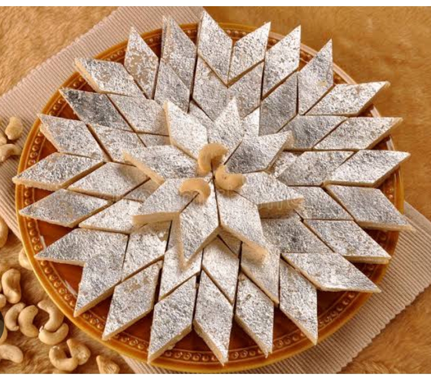 काजू – 1 कपचीनी – ½ कपपानी – ¼ कपघी – 1 चम्मचचांदी का वर्क (वैकल्पिक)—👩🍳 विधि (Method)1. काजू तैयार करें:काजू को 2–3 घंटे फ्रीज़र में रख दें (यह पीसने में आसान होगा)।फिर इन्हें मिक्सर में बारीक पाउडर बना लें। ध्यान रहे ज़्यादा देर न चलाएँ वरना काजू से तेल निकल आएगा।2. चीनी की चाशनी बनाएं:एक पैन में चीनी और पानी डालें।धीमी आँच पर एक तार की चाशनी बनने तक पकाएँ।3. काजू पाउडर मिलाएँ:अब चाशनी में काजू पाउडर डालें और लगातार चलाते रहें।मिश्रण गाढ़ा होने लगे तो उसमें थोड़ा घी डाल दें।जब मिश्रण पैन छोड़ने लगे, तब गैस बंद कर दें।4. सेट करना:एक प्लेट या ट्रे में घी लगाकर मिश्रण डालें।ऊपर से चम्मच या बेलन से समान फैला दें।चाहें तो ऊपर चांदी का वर्क लगाएँ।