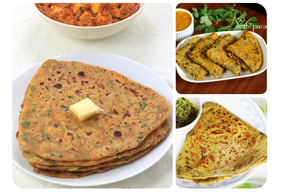 का आटा – 2 कपताज़ी मेथी की पत्तियाँ – 1 कप (बारीक कटी हुई)अदरक – 1 छोटा टुकड़ा (कद्दूकस किया हुआ)हरी मिर्च – 1 (बारीक कटी हुई, वैकल्पिक)नमक – स्वादानुसारलाल मिर्च पाउडर – ½ छोटा चम्मचहल्दी – ¼ छोटा चम्मचअजवाइन – ½ छोटा चम्मचतेल – 1 बड़ा चम्मच (आटे में डालने के लिए)पानी – आवश्यकतानुसारसेकने के लिए:तेल या घी – परांठे सेकने के लिए—👩🍳 विधि (Method):1. मेथी तैयार करें:मेथी की पत्तियाँ धोकर बारीक काट लें।अगर मेथी थोड़ी कड़वी लगती है, तो उस पर थोड़ा नमक छिड़ककर 10 मिनट रख दें और फिर निचोड़ लें।2. आटा गूंधें:एक बड़े बर्तन में आटा, कटी मेथी, अदरक, हरी मिर्च, मसाले, अजवाइन, नमक और तेल डालें।धीरे-धीरे पानी डालते हुए मुलायम और सख्त आटा गूंध लें।आटे को 10–15 मिनट के लिए ढककर रख दें।3. लोइयाँ बनाएं और बेलें:आटे की बराबर की लोइयाँ तोड़ें।प्रत्येक लोई को गोल बेलें।चाहें तो हल्का तेल लगाकर दो बार फोल्ड करें और परतदार परांठा बेलें।4. परांठा सेंकें:गरम तवे पर परांठा डालें।हल्का सुनहरा होने पर पलटें और तेल/घी लगाएं।दोनों तरफ से सुनहरा भूरा और कुरकुरा होने तक सेंकें।5. परोसें:गर्मागर्म परांठे को दही, अचार, या सफेद मक्खन के साथ परोसें। 😋