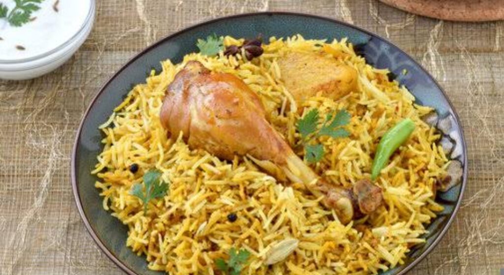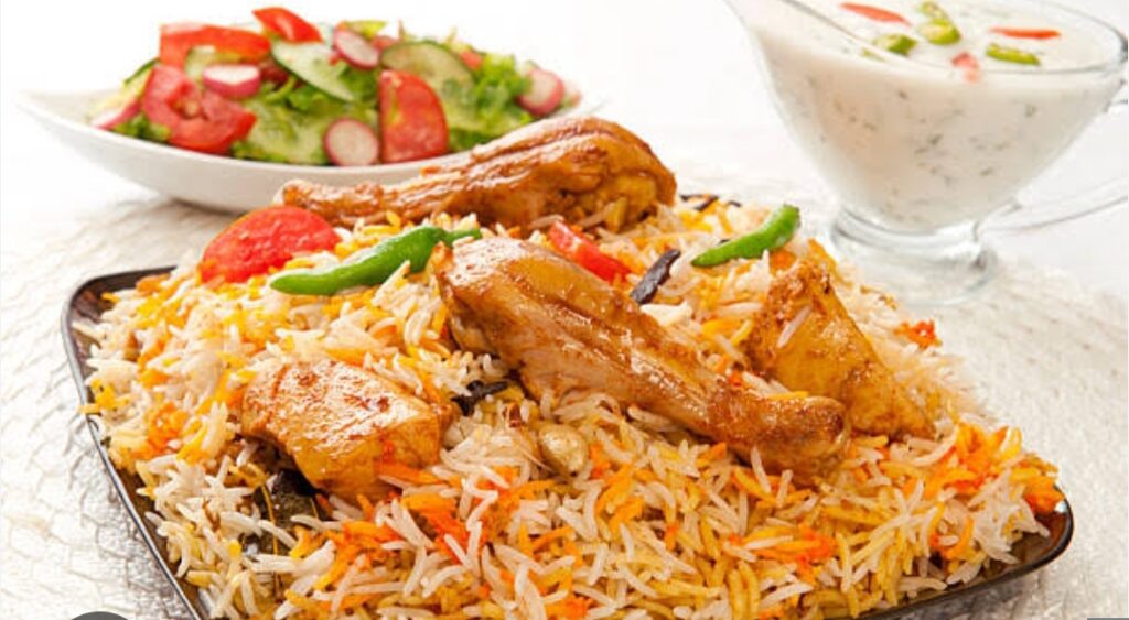 चिकन मैरिनेशनसभी मैरिनेशन की सामग्री चिकन में अच्छी तरह मिलाएँ।कम से कम 2–4 घंटे (बेहतर स्वाद के लिए रात भर) मैरिनेट करें।2️⃣ चावल उबालनापानी उबालें, उसमें साबुत मसाले और नमक डालें।चावल डालकर 70% तक पकाएँ।पानी छान लें।3️⃣ बिरयानी की लेयरिंगभारी तले की देगची में सबसे नीचे मैरिनेट किया चिकन रखें।ऊपर से आधे चावल डालें।पुदीना, धनिया, तले प्याज़ डालें।फिर बाकी चावल डालें।केसर वाला दूध, घी और गुलाब/केवड़ा जल डालें।4️⃣ दम देनाढक्कन कसकर बंद करें (आटे से सील कर सकते हैं)।पहले 5 मिनट तेज आंच, फिर 25–30 मिनट धीमी आंच पर दम दें।5️⃣ परोसनादम खोलें, हल्के से मिलाएँ और गरमागरम बिरयानी परोसें।—🥗 परोसने के साथमिर्च का सालनबूंदी रायताप्याज़-नींबू सलादअगर आप चाहें तो मैं हैदराबादी वेज बिरयानी या