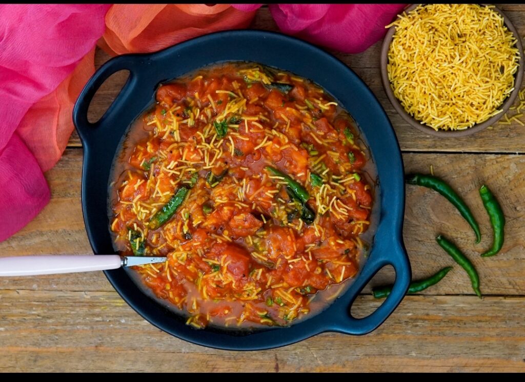 मुख्य सामग्री (2-4 लोगों के लिए):1. टमाटर – 4 से 5 मध्यम आकार के (बारीक कटे हुए)2. हरी मिर्च – 2 (बारीक कटी हुई)3. अदरक – 1 इंच का टुकड़ा (कद्दूकस किया हुआ)4. हींग – एक चुटकी5. जीरा – ½ छोटा चम्मच6. राई (सरसों) – ½ छोटा चम्मच (ऐच्छिक)7. हल्दी पाउडर – ¼ छोटा चम्मच8. धनिया पाउडर – 1 बड़ा चम्मच9. लाल मिर्च पाउडर – ½ छोटा चम्मच (स्वादानुसार)10. गरम मसाला – ½ छोटा चम्मच11. नमक – स्वादानुसार12. तेल – 2 बड़े चम्मच (सरसों का तेल ज्यादा स्वादिष्ट लगता है)13. बेसन की सेव – 1 कप (मोटी या बारीक – आपकी पसंद के अनुसार)14. हरा धनिया – बारीक कटा हुआ (सजावट के लिए)15. चीनी – ½ छोटा चम्मच (टमाटर की खटास को बैलेंस करने के लिए – ऐच्छिक)—बनाने की विधि:चरण 1: तैयारीसबसे पहले सारे टमाटर को धोकर बारीक काट लें। अदरक को कद्दूकस कर लें और हरी मिर्च को बारीक काट लें। अगर आप तीखा खाना पसंद करते हैं तो मिर्च की मात्रा बढ़ा सकते हैं। सेव आप बाजार से तैयार ले सकते हैं या घर में भी बना सकते हैं।चरण 2: तड़का लगानाएक कढ़ाई में तेल गर्म करें। अगर आप सरसों का तेल उपयोग कर रहे हैं तो उसे अच्छी तरह धुआँ छोड़ने तक गर्म करें, ताकि उसका तीखापन निकल जाए। अब गैस को मध्यम आंच पर लाकर उसमें हींग, राई और जीरा डालें। जैसे ही जीरा चटकने लगे, उसमें कटी हुई हरी मिर्च और अदरक डालें। कुछ सेकंड भूनें।चरण 3: मसाले भूननाअब इसमें हल्दी, धनिया पाउडर और लाल मिर्च पाउडर डालें। मसालों को कुछ सेकंड धीमी आँच पर भूनें ताकि उनका कच्चापन निकल जाए। ध्यान रखें कि मसाले जलें नहीं।चरण 4: टमाटर डालनाअब इसमें कटे हुए टमाटर डालें और अच्छे से मिलाएं। थोड़ा नमक डालें जिससे टमाटर जल्दी गल जाएं। इसे ढककर मध्यम आँच पर 7-10 मिनट तक पकने दें। बीच-बीच में चलाते रहें ताकि टमाटर नीचे से चिपकें नहीं।चरण 5: मसाला पकने तक इंतजारजब टमाटर अच्छे से गल जाएं और उनका रस निकलने लगे, तब आप देखेंगे कि एक गाढ़ा सा मसाला बन गया है। अगर टमाटर ज़्यादा खट्टे हैं तो इसमें आधा छोटा चम्मच चीनी डाल सकते हैं।चरण 6: पानी डालनाअब आवश्यकता अनुसार पानी डालें। यह आपके ऊपर निर्भर करता है कि आप सब्ज़ी को कितना पतला या गाढ़ा रखना चाहते हैं। सामान्यतः यह सब्ज़ी थोड़ी रसेदार बनाई जाती है ताकि सेव डालने के बाद वह सूखी न लगे। पानी डालने के बाद एक बार उबाल आने दें।चरण 7: गरम मसाला डालनाजब ग्रेवी तैयार हो जाए, तब उसमें गरम मसाला डालें और अच्छे से मिला लें। अब गैस को धीमा कर दें और स्वाद अनुसार नमक भी चख लें।—चरण 8: सेव डालनाअब सबसे अहम स्टेप – सेव डालने का।यह स्टेप आप दो तरीकों से कर सकते हैं:1. तुरंत परोसने से पहले सेव डालना: जब सब्ज़ी तैयार हो जाए और आप परोसने जा रहे हों, तभी सेव डालें। इससे सेव क्रिस्पी बनी रहती है और खाने में कुरकुरापन आता है।2. पहले से सेव डालकर पका