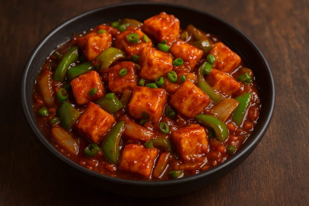 1. एक बाउल में मैदा, कॉर्नफ्लोर, नमक और काली मिर्च मिलाएं।2. थोड़ा पानी डालकर घोल बना लें (ना ज्यादा गाढ़ा हो, ना पतला)।3. पनीर के टुकड़ों को इस घोल में डुबोकर गर्म तेल में गोल्डन ब्राउन होने तक तलें।4. फ्राय किए हुए पनीर को निकाल कर अलग रखें।स्टेप 2: मसाला तैयार करना1. एक कड़ाही में 2 टेबल स्पून तेल गर्म करें।2. उसमें लहसुन, अदरक और हरी मिर्च डालकर हल्का भूनें।3. फिर प्याज और शिमला मिर्च डालकर 2-3 मिनट तक तेज आंच पर भूनें।4. अब इसमें सोया सॉस, रेड चिल्ली सॉस, टोमेटो केचप और सिरका डालें।5. थोड़ा नमक डालें (ध्यान रखें सॉस में भी नमक होता है)।6. सबको अच्छी तरह मिलाकर 1-2 मिनट पकाएं।स्टेप 3: पनीर मिलाना1. अब तले हुए पनीर के टुकड़े इसमें डाल दें।2. अच्छी तरह मिलाकर 2-3 मिनट तक पकाएं ताकि पनीर में सारे फ्लेवर आ जाएं।3. ऊपर से हरा प्याज डालकर गार्निश करें।—🍽️ सर्व करने का तरीका:चिल्ली पनीर को गरमागरम हक्का नूडल्स, फ्राइड राइस या ऐसे ही स्टार्टर के रूप में सर्व करें।—अगर आप चाहें तो ग्रेवी वाला चिल्ली पनीर बनाने की रेसिपी भी बता सकता हूँ।
