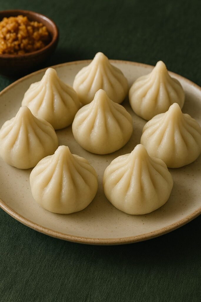 2. मोदक के भरावन की तैयारी:एक कढ़ाई में 1 चमच घी गरम करें। अब उसमें कद्दूकस किया हुआ ताजे नारियल डालें।नारियल को हल्का भून लें, ताकि वह खुशबूदार और थोड़ा चटपटा हो जाए।अब इसमें कद्दूकस किया हुआ गुड़ डालें और उसे अच्छे से मिला लें। गुड़ को पूरी तरह से घुलने दें। गुड़ के साथ नारियल की अच्छी मिठास मिलनी चाहिए।जब गुड़ पूरी तरह से घुल जाए और मिश्रण थोड़ा गाढ़ा हो जाए, तब इसमें इलायची पाउडर डालें। इसे अच्छे से मिला लें।अगर आप चाहें तो इसमें किशमिश और बारीक कटे हुए बादाम, काजू भी डाल सकते हैं।अब इसे आंच से हटा लें और ठंडा होने दें। भरावन तैयार है।3. मोदक को आकार देना:अब गूंथे हुए आटे को छोटे-छोटे भागों में बांट लें। हर भाग को गोल आकार में लीजिए।गोल आकार को दबाकर थोड़ा चपटा करें ताकि वह एक छोटी प्लेट के जैसा आकार ले ले।बीच में एक चमच भरावन रखें और फिर धीरे-धीरे आटे के किनारों को एक साथ लाकर मोदक का आकार दे दें। अगर आप चाहें तो मोदक के ऊपर उंगलियों से हलके-हलके उकेर कर डिजाइन भी बना सकते हैं। यह न केवल सुंदर दिखेगा, बल्कि मोदक पकाते समय भरावन बाहर नहीं निकलेगा।4. मोदक पकाना:एक स्टीमर या किसी बड़े बर्तन में पानी गरम करें।जब पानी अच्छे से उबालने लगे, तो मोदकों को स्टीमर की ट्रे में रखें। ध्यान रखें कि मोदक आपस में छुए नहीं।10-12 मिनट तक मोदक को स्टीम करें। मोदक स्टीम होते समय फूलकर सॉफ्ट हो जाएंगे।एक बार मोदक स्टीम हो जाएं, तो उन्हें बाहर निकाल लें और थोड़ा ठंडा होने दें।5. मोदक पर घी लगाना (वैकल्पिक):मोदक के ऊपर थोड़ा सा घी लगाकर उसकी चमक बढ़ा सकते हैं। घी से मोदक न केवल और स्वादिष्ट लगते हैं, बल्कि उनकी बनावट भी बढ़िया हो जाती है।मोदक बनाने के टिप्स:1. आटे की गुणवत्ता: मोदक का आटा सही प्रकार से गूंथा हुआ होना चाहिए, ताकि मोदक सॉफ्ट और बिना टूटे बनें।2. भरावन का मिश्रण: गुड़ और नारियल का मिश्रण न तो बहुत गाढ़ा होना चाहिए, न ही बहुत पतला। यह भरावन ठीक से मोदक में समाने के लिए आदर्श होना चाहिए।3. स्टीमिंग का समय: मोदक को ज्यादा देर तक स्टीम न करें, वरना वे टूट सकते हैं। 10-12 मिनट पर्याप्त होते हैं।